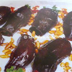 ١. يحفر الباذنجان وينقع بالماء والملح، ثم يقلى اللحم بقليل من زيت الذرة ويتبل بالملح والفلفل الأسود، ثم يُقلى الصنوبر ويخلط مع اللحم ويترك منه للتزيين.