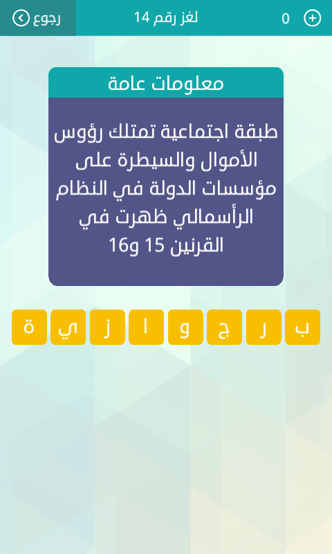 حل طبقة اجتماعية تمتلك رؤوس الاموال والسيطرة على مؤسسات الدولة فى النظام الراسمالى ظهرت فى القرنين 15 او 16 رقم 14 من المجموعة التاسعة من لعبة وصلة