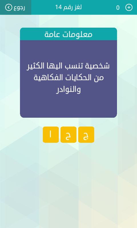 حل معلومات عامة شخصية تنسب اليها الكثير من الحكايات الفكاهية والنوادر لغز رقم 77 من المجموعة التاسعة من لعبة وصلة