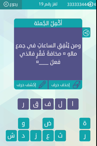 جواب وما بنفق الساعات فى جمع ماله مخافة فقر فالذى فعل ــــــــــ لغز رقم 19 من لعبة وصلة للمجموعة الثالثة