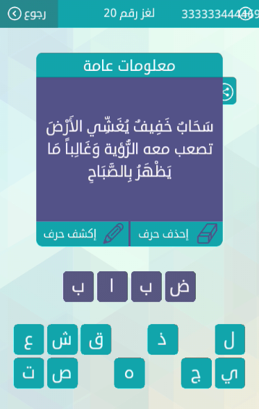 جواب سحاب خفيف يغشى الارض تصعب معه الرؤية وغالبا ما يظهر بالصباح لغز رقم 20 من لعبة وصلة للمجموعة الثالثة