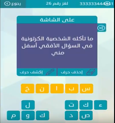 جواب ما تاكله الشخصية الكرتونية فى السؤال الافقى اسفل منى لغز رقم 26 من لعبة وصلة للمجموعة الثالثة