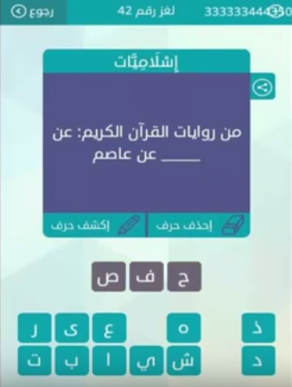 اجابة لغز من روايات القرآن الكريم , عن ـــ عن عاصم من لعبة وصلة المجموعة الخامسة لغز رقم 42
