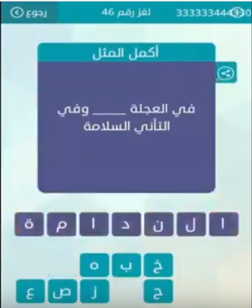 حل سؤال فى العجلة ـــــ وفى التأنى السلامة لغز رقم 46 من لعبة وصلة فى المجموعة السادسة