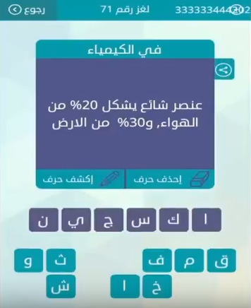 حل لغز عنصر شائع بشكل 20 % من الهواء و 30 % من الارض من لعبة وصلة المجموعة الثامنة لغز رقم 71