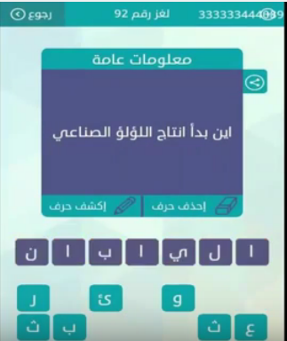 جواب سؤال اين بدا انتاج اللؤلؤ الصناعى لغز رقم 92 من لعبة وصلة للمجموعة الحادى عشر