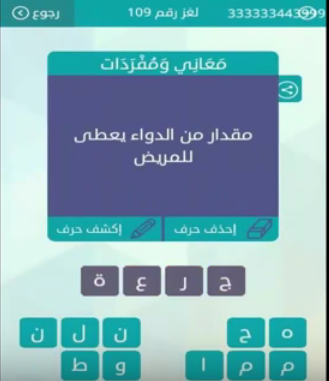 اجابة سؤال مقدار من الدواء يعطى للمريض لغز رقم 109 من لعبة وصلة فى المجموعة الثالثة عشرة