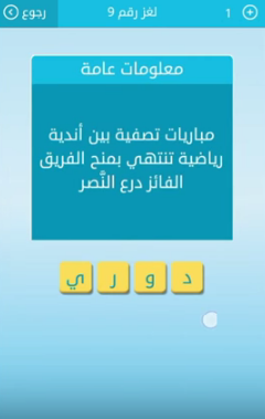 اجابة لغز مباريات تصفية بين اندية رياضية تنتهى بمنح الفريق الفائز درع النصر من لعبة رشفة اللغز رقم 9 من المجموعة الاولى