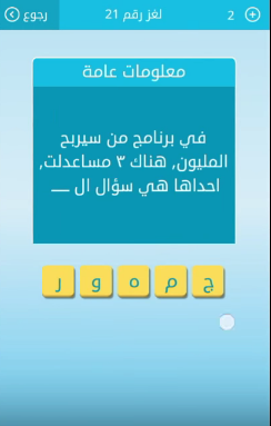 جواب فى برنامج من سيربح المليون هناك 3 مساعدات احداها هى سؤال ال ـــ من لعبة رشفة لغز رقم 21 للمجموعة الثالثة