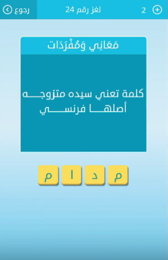 جواب لغز كلمة تعنى سيدة متزوجة اصلها فرنسى من لعبة رشفة لغز رقم 24 للمجموعة الثالثة