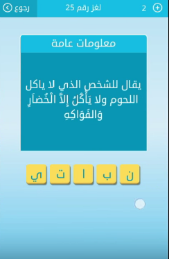 حل يقال للشخص الذى لا ياكل اللحوم ولا ياكل الا الخضار والفواكه من لعبة رشفة لغز رقم 25 للمجموعة الثالثة
