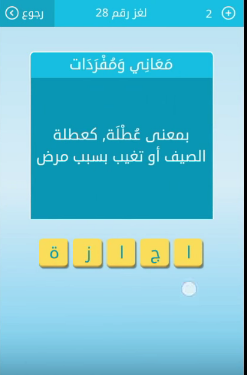 حل لغز بمعنى عطلة كعطلة الصيف او تغيب بسبب مرض من لعبة رشفة لغز رقم 28 للمجموعة الرابعة