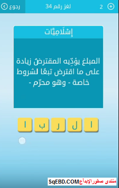 جواب المبلغ يؤديه المقترض زيادة على ما افترض تبعا لشروط خاصة وهو محرم من لعبة رشفة لغز رقم 34 للمجموعة الرابعة