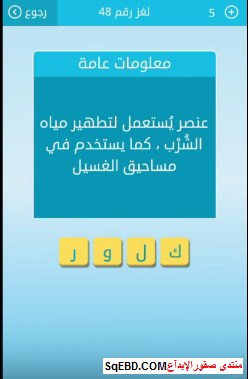 جواب لغز عنصر يستعمل لتطهير مياه الشرب كما يستخدم فى مساحيق الغسيل من اللغز رقم 48 من لعبة رشفة للمجموعة السادسة