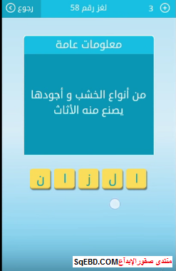 جواب سؤال من انواع الخشب واجودها يصنع منه الاثاث لغز رقم 58 للمجموعة السابعة من لعبة رشفة