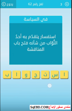اجابة سؤال استفسار يتقدم به احد النواب من شأنه فتح باب المناقشة لغز رقم 62 للمجموعة السابعة من لعبة رشفة