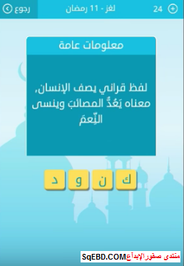 حل سؤال لفظ قراني يصف الانسان معناه يعد المصائب وينسي النعم من لغز 11 رمضان من لعبة رشفة رمضانية