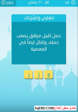 اجابة لغز حمل ثقيل مرهق يصعب حمله وتقال ايضا في المعصية من لغز 11 رمضان من لعبة رشفة رمضانية
