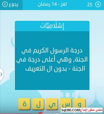 حل سؤال درجة الرسول الكريم في الجنة وهي أعلى درجة في الجنة - بدون ال التعريف
