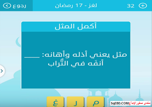 اجابة سؤال مثل يعني أذله واهانه : ... انفه في التراب من لغز 17 رمضان من لعبة رشفة رمضانية