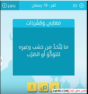 جواب سؤال ما يتخذ من خشب وغيره للتوكؤ او الصرب من 3 حروفمن لغز 18 رمضان من لعبة رشفة رمضانية
