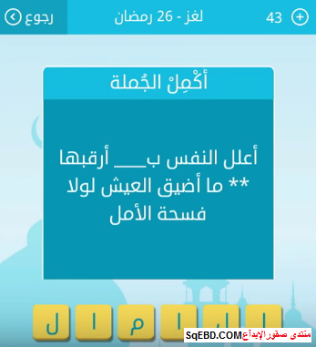 جواب لغز اعلل النفس ب.... ارقبها.. ما أضيق العيش لولا فسحة الأمل 26 رمضان من لعبة رشفة رمضانية