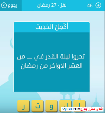 حل سؤال حروا ليلة القدر في ... من العشر الاواخر من رمضان 27 رمضان من لعبة رشفة رمضانية