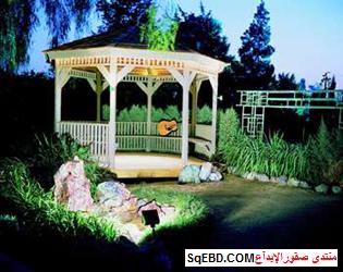 كما يفضل إخفاء مصدر الإضاءة ما أمكن عن العين فتوضع المصابيح بين أفرع الأشجار أو خلف الشجيرات والصخور ويجب ألا تزيد قوة المصباح عن 150 وات وإذا كانت الحاجة إلى إكثار من ذلك فيجب وضع عدة مصابيح بدل مصباح واحد . كذلك تستخدم المصابيح في الأحواض والبرك المائية لإضاءة أحواض السباحة أو النافورات والبرك أو البحيرات الاصطناعية وفي هذه الحالة يجب تصميم شبكة الكهرباء بشكل خاص يمنع تسرب المياه إليها .