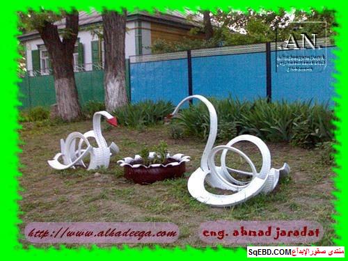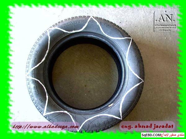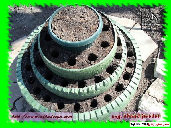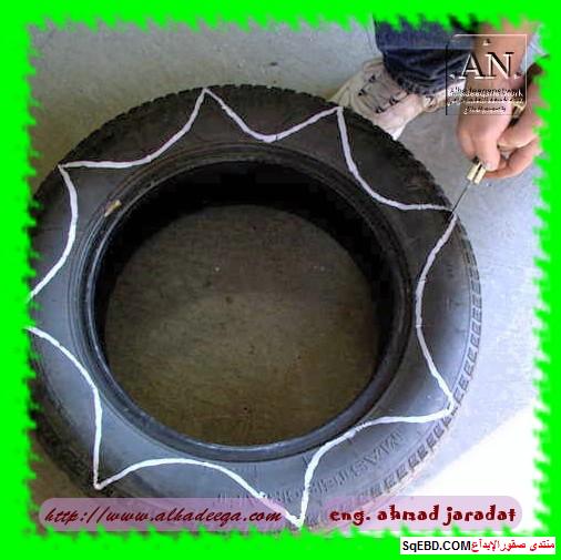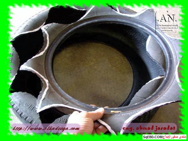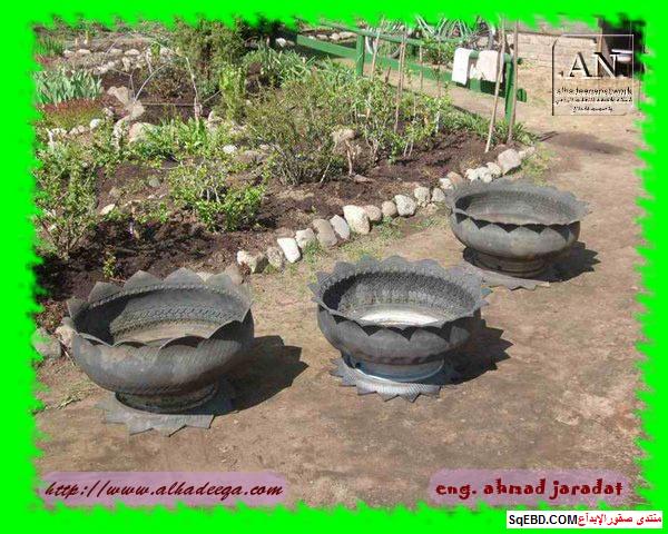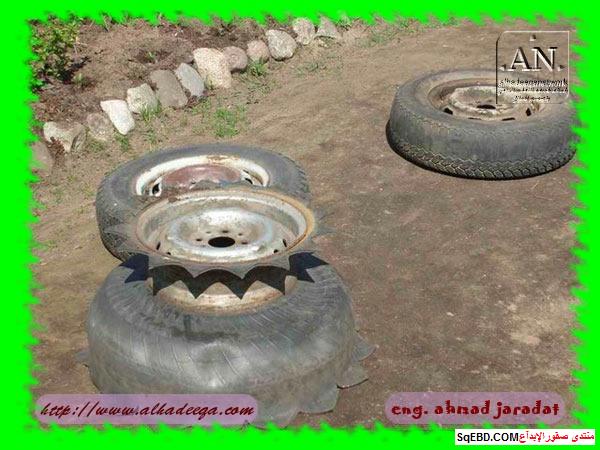 جزء من الاطارات تحول لحوض ارضي للزراعه واخرى تحولت الى اشكار وتشكيلات كالطيور بعد القص والتشكيل