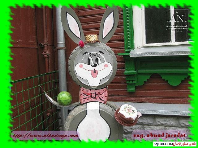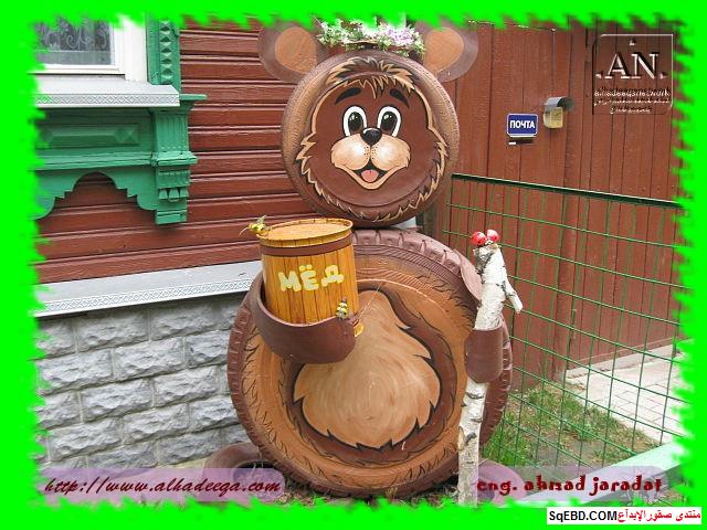 الصورة اعلاه كانت مدخل للبيت وتحولت الاطارات لشكل تمثال دوب جميل وانيق يفرح به الصغار وبنفس الوقت استغل لعمل صندوق بريد فما رأيكم