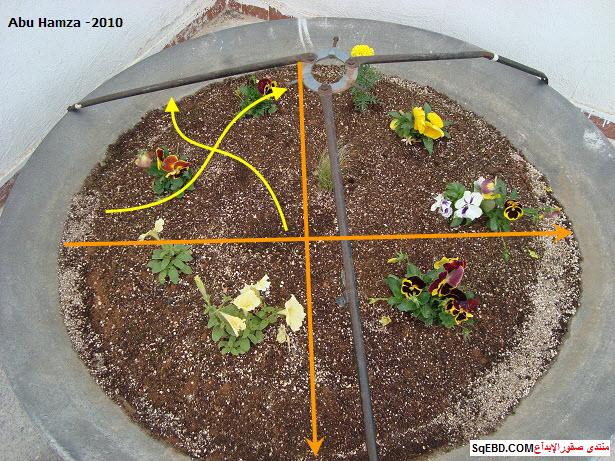 4- نقوم باضافة ورش كمية من السماد المركب فوق البذور بشكل كافي ولحوضنا المقترح بقطر مترين يكفي ما يقارب نصف كيلو من السماد ننثرها بشكل منظم كما في الصوره اعلاه بشكل قطري واعني بذلك باتجاهين متعامدين