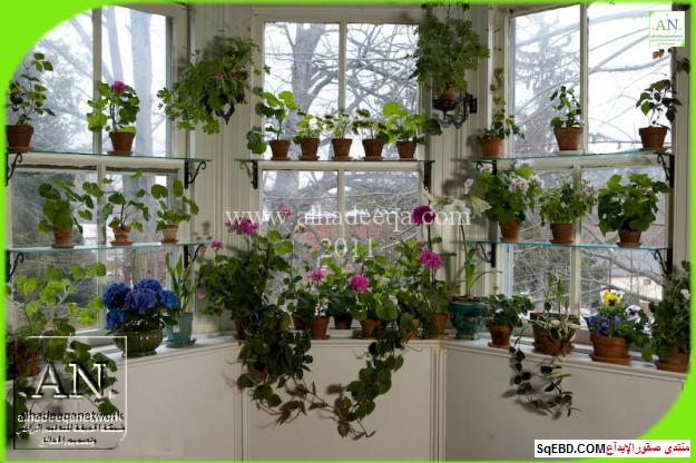في الصوره اهلاه تجدون نموذج لحديقة في غرفة مكتب جميله تظهر جمالها في يناير كانون الثاني ... تم الاستعانه بالنجار لعمل سطح واسع للنافذه ليتسع للنباتات ويشكل امتداد طبيعي للنافذه ... ومن ثم كانت اقواس وحاملات للرفوف الزجاجيه المتوزعه على ارتفعات متساويه فوق النافذه ... ووضع فيها انواع مختلفه من النباتات منها الجيرانيوم بانواعه الورقيه والمزهره ( geraniums of all kinds, pansies, amaryllis, blue hydrangeas, and vines. On the brackets are rose-scented geraniums. )