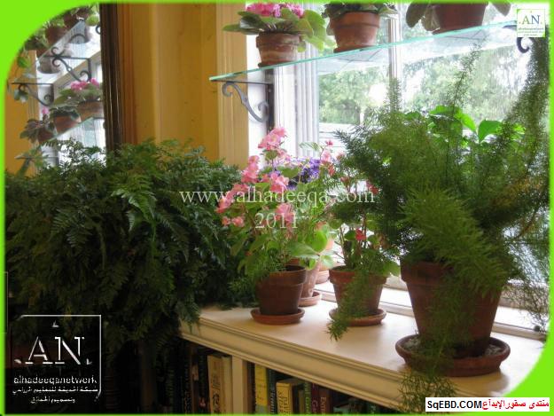 وفي الرد على حواف النوافذ الضيقه التي لا تصلح لان تحمل اي نبات او اصيص فان الجواب والحل الامثل لمثل ذلك هو عمل رف صناعي بنفس مستوى الحافه مع ربطه بها ومد الدهان عليه ليصبح كما لو كان جزء من الحافه ... او يمكن كما في الصوره من اختيار قطعه جميله من الاثاث كطاوله او ما شابه ك لجعل المنظر اكثر جمال واعطاء مساحه كافيه لوضع النباتات .