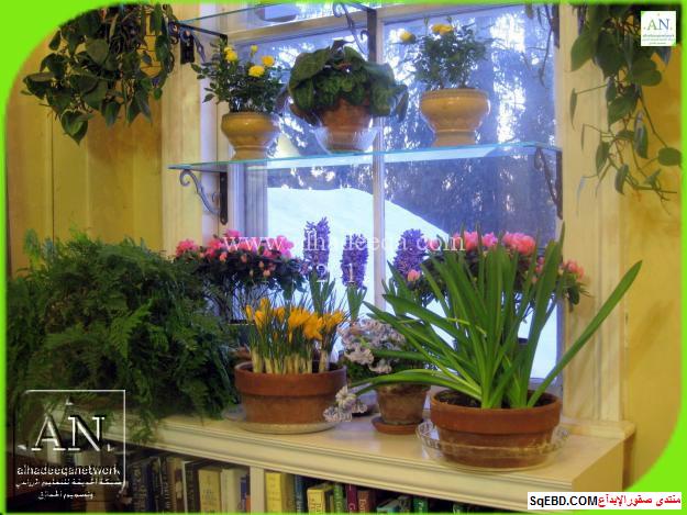 حافة النافذه وحدها لا تكفي لاعطاء حركه جميله وفرصه للعين للتحرك من موقع للاخر فمن الجميل ان يكون هناك تنوع وتدرج وما يجذب الانتباه بوجود مجموعة من الرفوف الزجاجايه اللامعه الجميله والقادره على حمل الاصص ... فنافذه متوسطه الحجم يكفي ان توجد لها 3 رفوف ... واحد مع مستوى حافة النافذه والثاني بمستوى محاذي لمنتصف النافذه ولكن بعيد عن مسكة النافذه ... والاخر اقل من قمة النافذه لاعطاء حركة وفرصه للعين للحركه