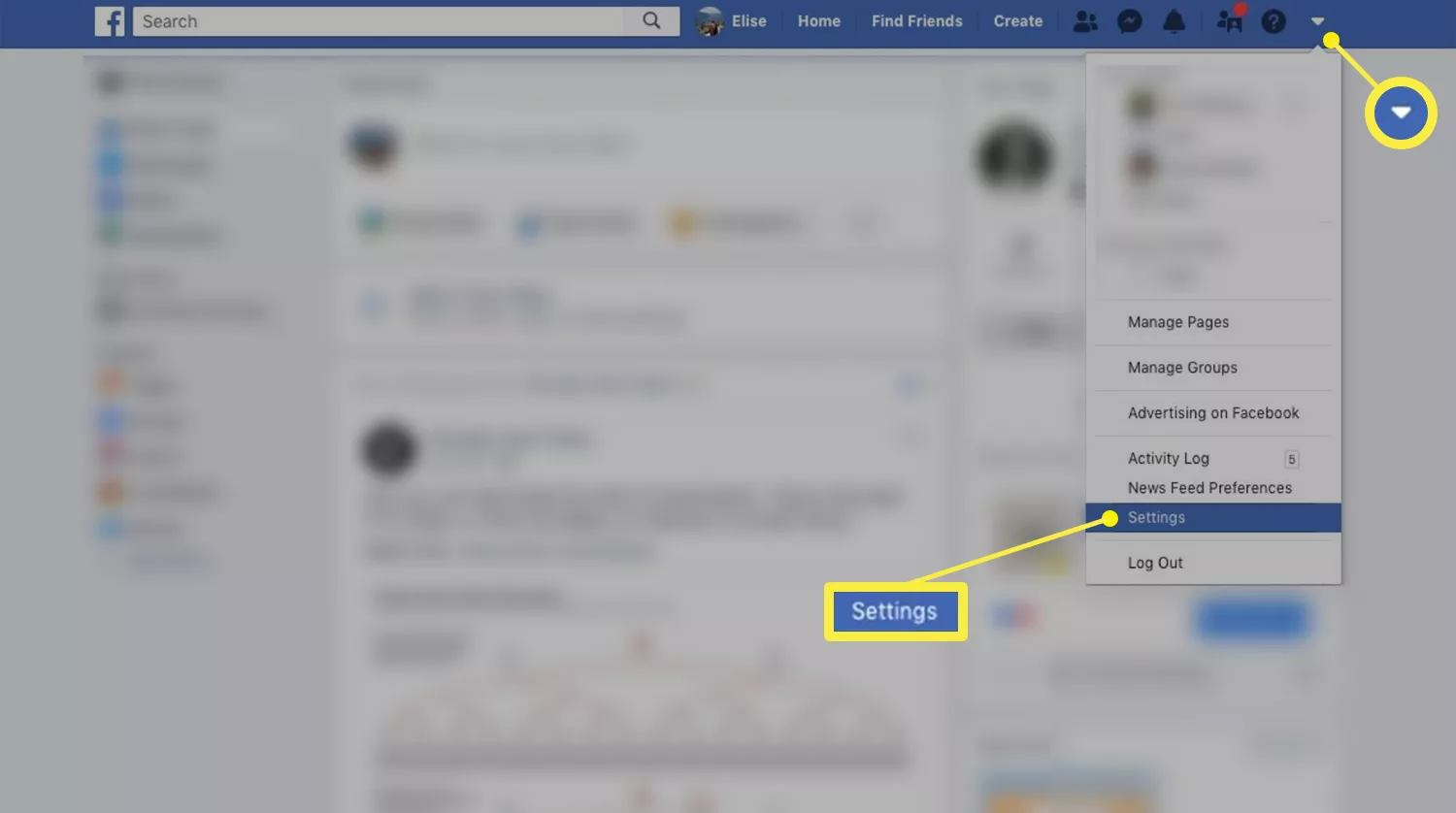 - أثناء تسجيل الدخول إلى حسابك على موقع Facebook.com ، حدد السهم لأسفل في الزاوية العلوية اليمنى واختر الإعدادات .