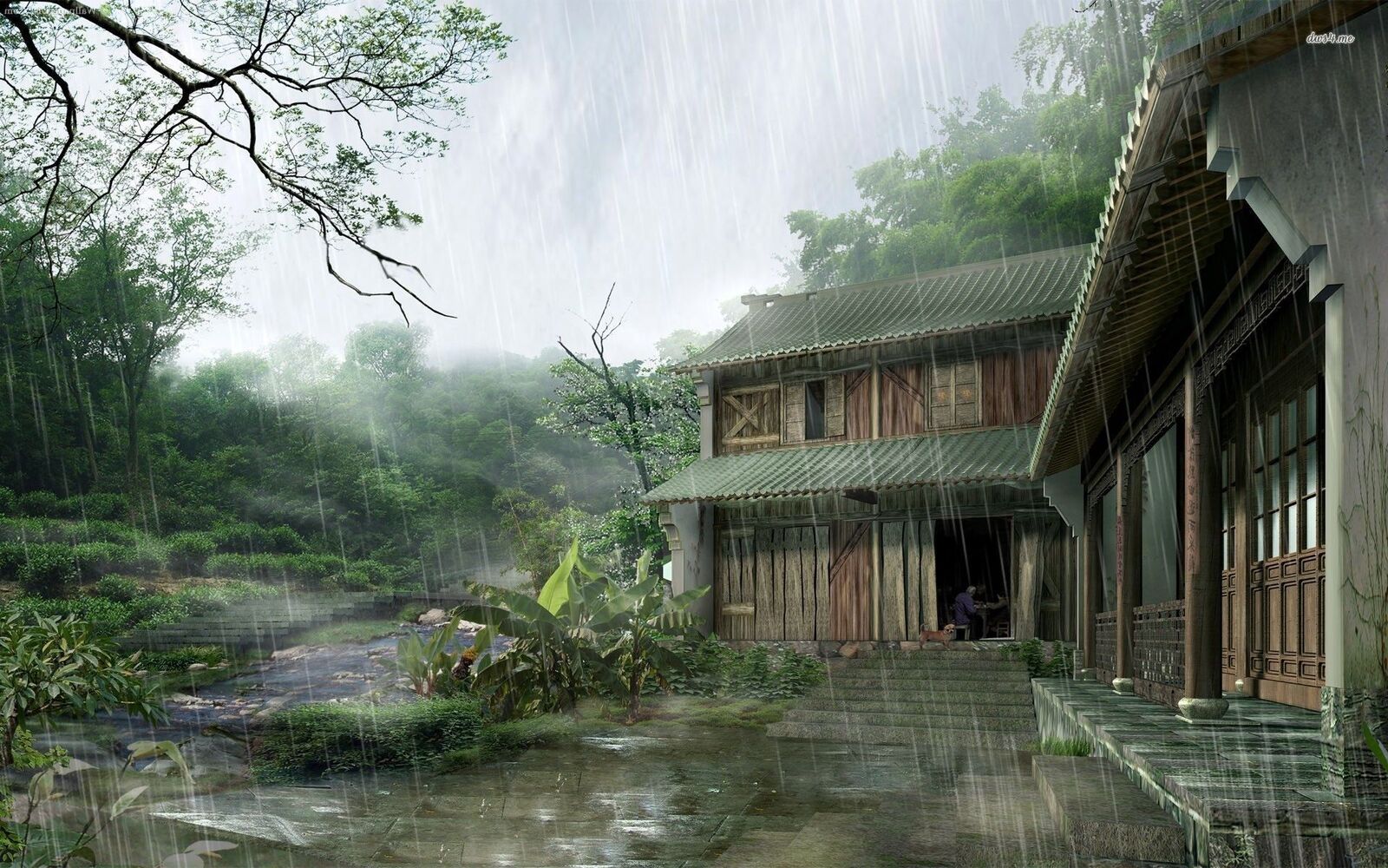 1024x768 المطر في خلفية القرية الصينية. ورق جدران عريض HD