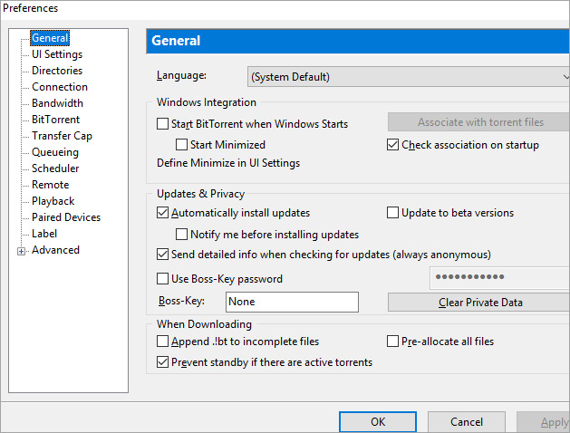 - ضمن علامة التبويب "عام" ، يمكنك السماح لبدء تشغيل التورنت في كل مرة يقوم فيها Windows ببدء تشغيله أو تعطيله.
