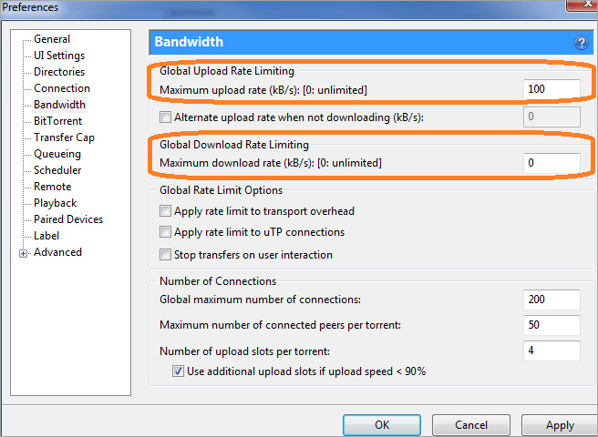 - لتقييد الحد الأقصى لمعدل التحميل والتنزيل ، قم بالتمرير لأسفل إلى النطاق الترددي. هذا مفيد بشكل خاص إذا لم يكن لديك النطاق العريض. يساعدك في مواصلة استخدام الويب.