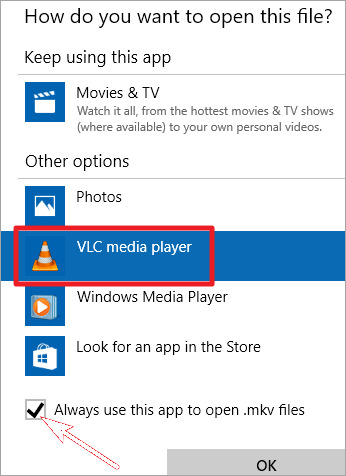 - حدد المربع بجوار استخدام هذا التطبيق دومًا لفتح خيار ملفات .mkv .