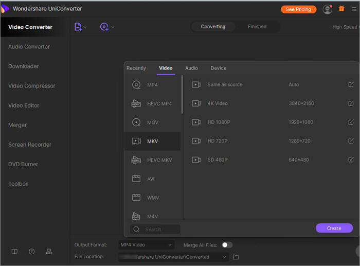 الإجابة: قم بتنزيل Wondershare UniConverter وتثبيته على جهاز الكمبيوتر الخاص بك وأضف ملف MKV إلى البرنامج إما عن طريق طريقة السحب والإفلات أو بالنقر فوق الزر + إضافة ملفات. على الزر الموجود بجانب تنسيق الإخراج ، انقر فوق السهم أدناه. سيفتح القائمة المنسدلة.