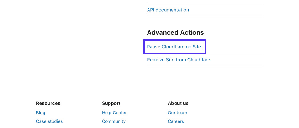 بعد ذلك ، قم بالتمرير لأسفل حتى ترى قسم الإجراءات المتقدمة في الشريط الجانبي. انقر فوق ارتباط إيقاف Cloudflare على الموقع .انقر فوق الارتباط لإيقاف Cloudflare مؤقتًا.