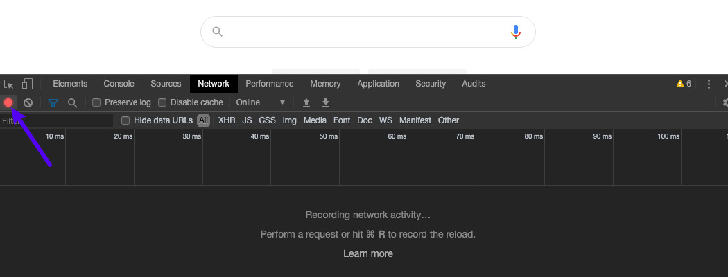 بمجرد فتح اللوحة ، انقر فوق علامة تبويب الشبكة وتأكد من وجود زر دائرة حمراء باتجاه الجانب العلوي الأيسر من اللوحة. إذا كان رماديًا ، فانقر فوقه.تأكد من أن زر التسجيل أحمر في علامة تبويب الشبكة.