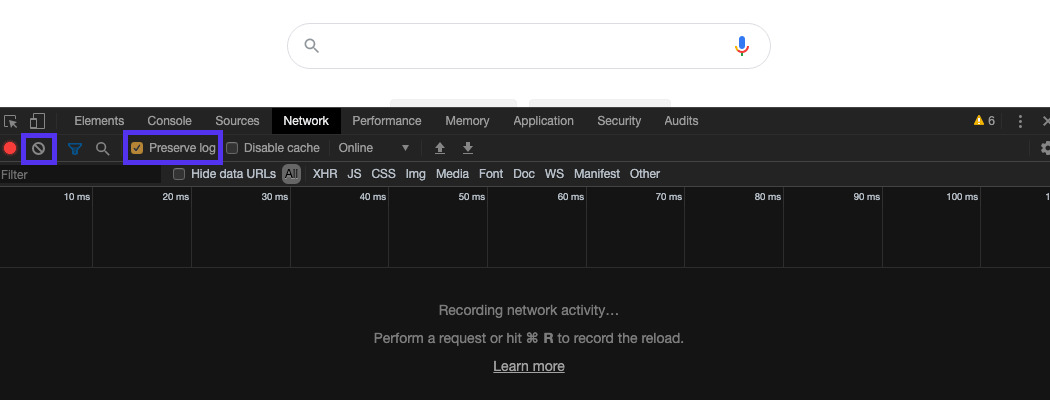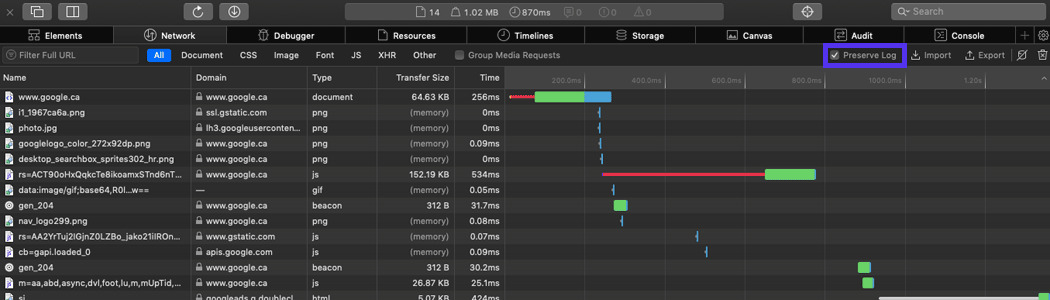 انتقل إلى علامة التبويب الشبكة . تحقق من خيار الاحتفاظ بالسجل ، ثم انتقل إلى الصفحة التي بها مشكلة الخطأ 520.حدد خيار الاحتفاظ بالسجل في علامة التبويب الشبكة.