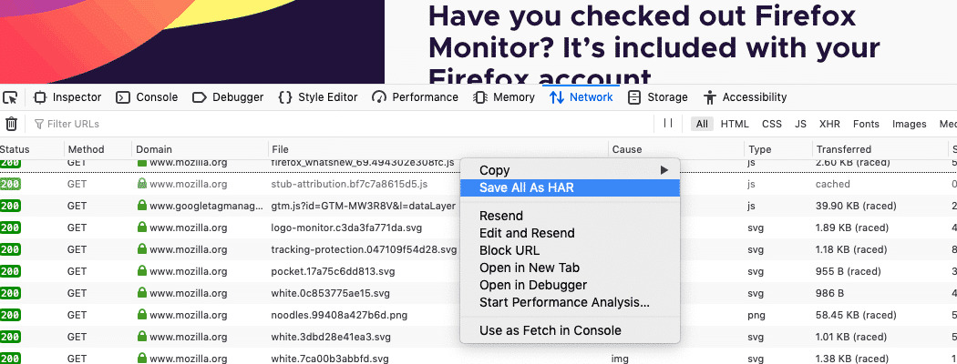 انقر بزر الماوس الأيمن واختر حفظ ملف HAR.