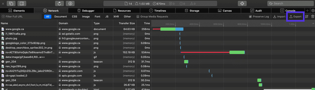 انقر فوق الزر "تصدير" واحفظ ملف HAR على جهاز الكمبيوتر الخاص بك.تصدير ملف HAR.