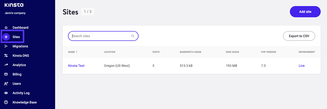 إذا كان موقعك مستضافًا مع Kinsta ، فيمكنك النقر فوق مواقع في القائمة ، ثم على موقعك المدرج.