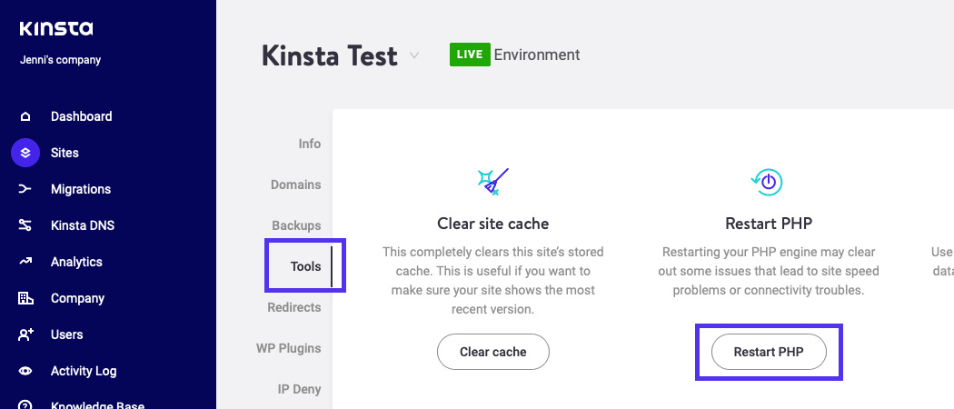 انتقل إلى علامة التبويب " أدوات" وانقر فوق الزر " إعادة تشغيل PHP" .يمكنك إعادة تشغيل PHP في لوحة تحكم MyKinsta.