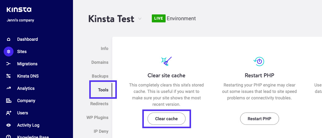 إذا كان موقعك مستضافًا على Kinsta ، فيمكنك إعادة تشغيل PHP ببضع نقرات.الخطوة 1