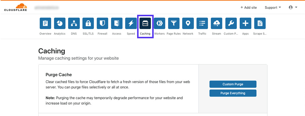 بعد تسجيل الدخول إلى Cloudflare ، انقر فوق علامة التبويب التخزين المؤقت باتجاه الجزء العلوي من الصفحة.انتقل إلى علامة التبويب التخزين المؤقت.