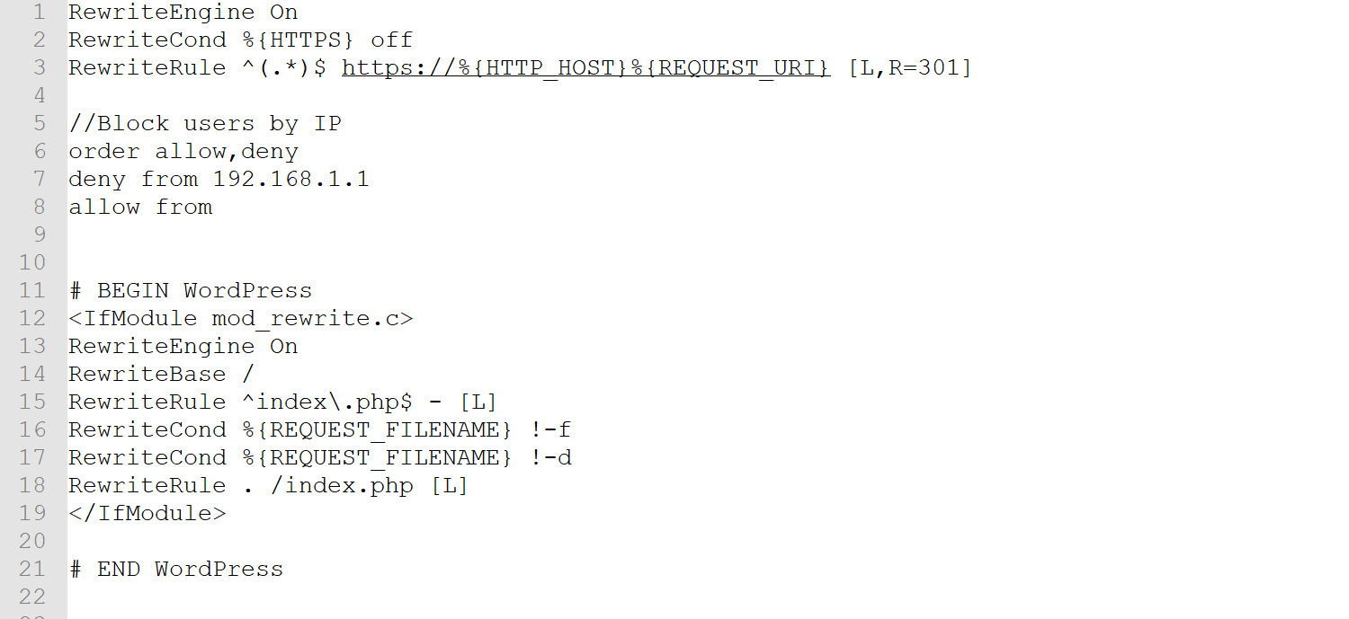 علاوة على ذلك ، يمكنك أيضًا إضافة مقتطفات الشفرة الخاصة بك إلى ملف htaccess الخاص بموقعك ، والذي يتيح لك تنفيذ إجراءات مثل: